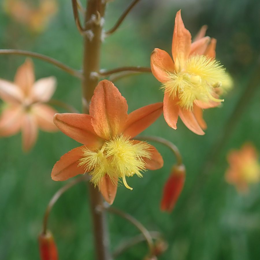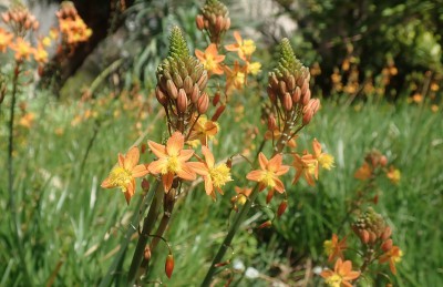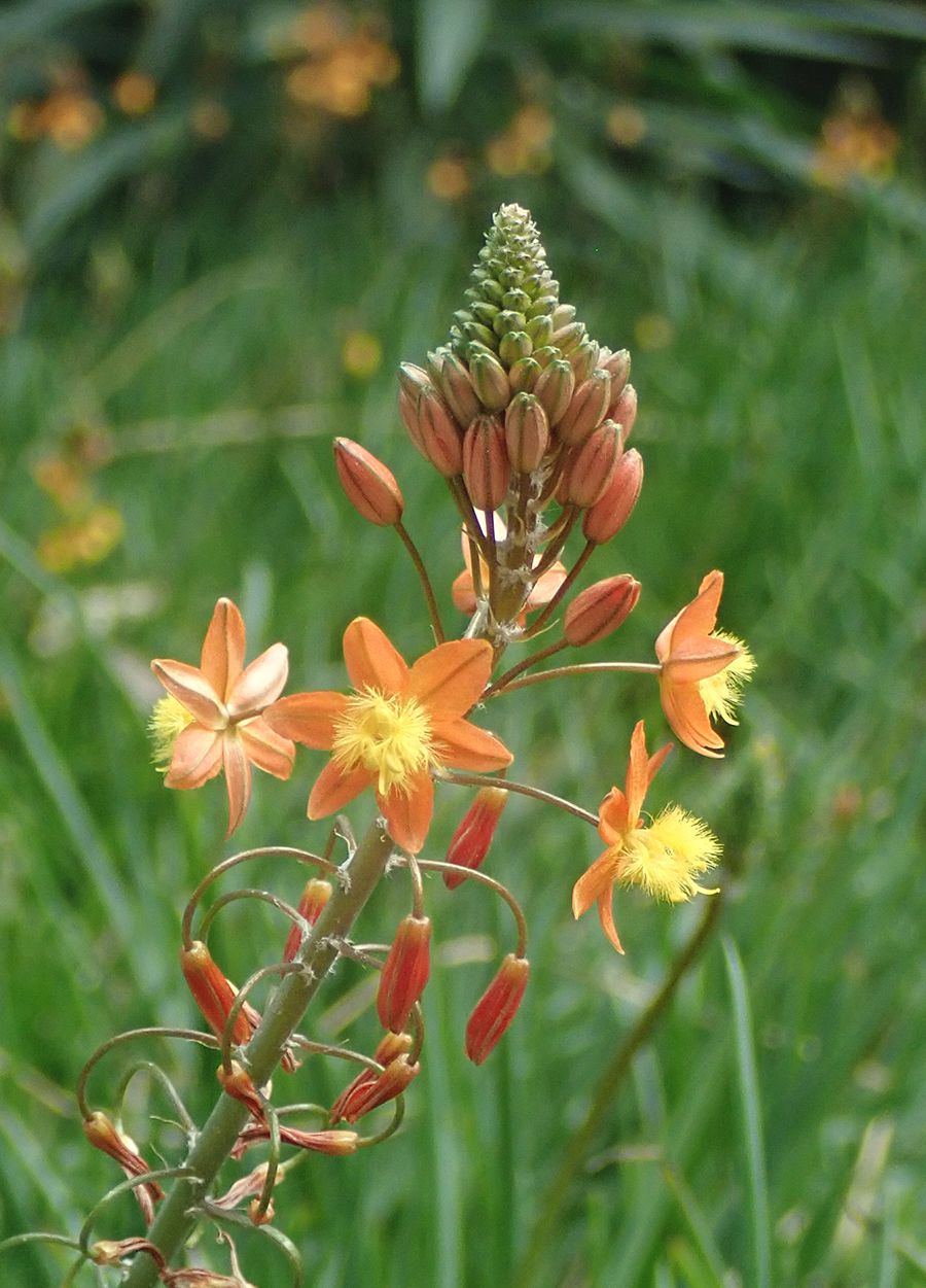 Una planta perenne de rápido crecimiento, con hojas verdes y carnosas que crecen en filas opuestas i que se juntan en su base. Las flores, reunidas en racimos verticales, tienen forma de estrella con 6 tépalos que pueden ser de color naranja o amarillo. Destacan sus curiosos estambres pubescentes de color amarillo, con numerosos pelos que les dan un aspecto suave. El fruto es una pequeña cápsula redondeada con semillas negras que se dispersan por el viento.