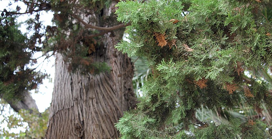 También crecen gran variedad de palmeras, desde las datileras pasando por sabales y washingtonias. En tierra, amparado por la sombra de los árboles, se extiende un manto de helechos, bruscos y cintas. En el centro del espacio encontraremos una explanada en la que el visitante puede sentarse en bancos, rodeado de aligustres, moreras del papel y una higuera.